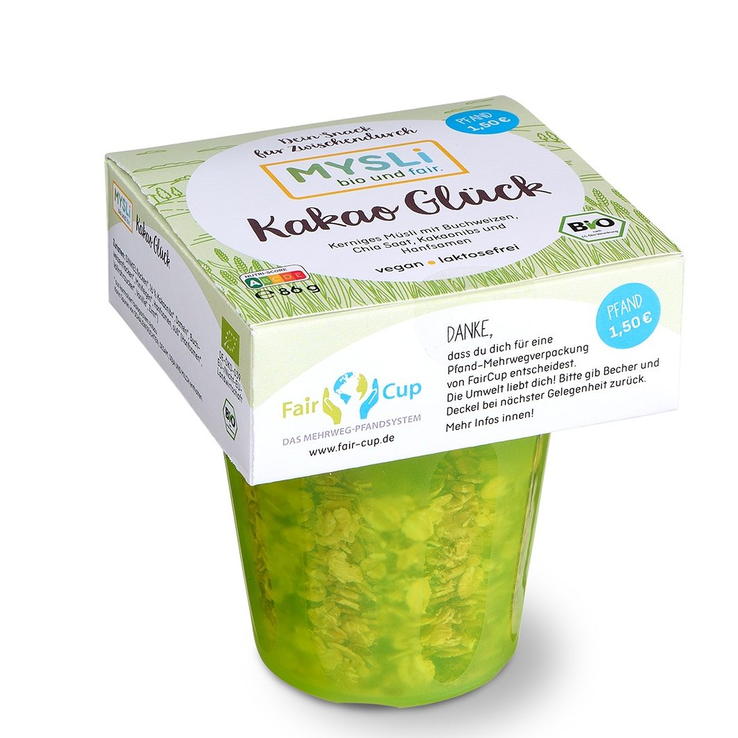 Unser Müsli wird im FairCup Mehrwegbecher ausgeliefert - Rückgabe, Reinigung und erneuter Nutzung im Kreislauf.